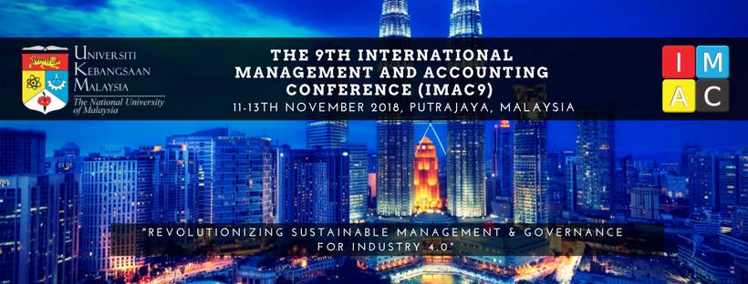 The 9th International Management and Accounting Conference (IMAC9) with the theme Revolutionising Sustainable Management and Governance for Industry 4.0 will be held from the 11th to 13th November 2018 in Putrajaya, Malaysia. Co-organised by the School of Management and the School of Accounting, Faculty of Economics and Management, Universiti Kebangsaan Malaysia, IMAC9 is co-sponsored by the Centre of Research and Instrumentation of UKM in conjunction with UKM's Integrated International Conference (UKM-IIC 2018). In this IMAC9, we will bring together leading academic researchers and scholars to an interesting knowledge sharing and exchange event which covers a wide spectrum of scholarships in the fields of Management and Accounting, within the realm of the Fourth Industrial Revolution.