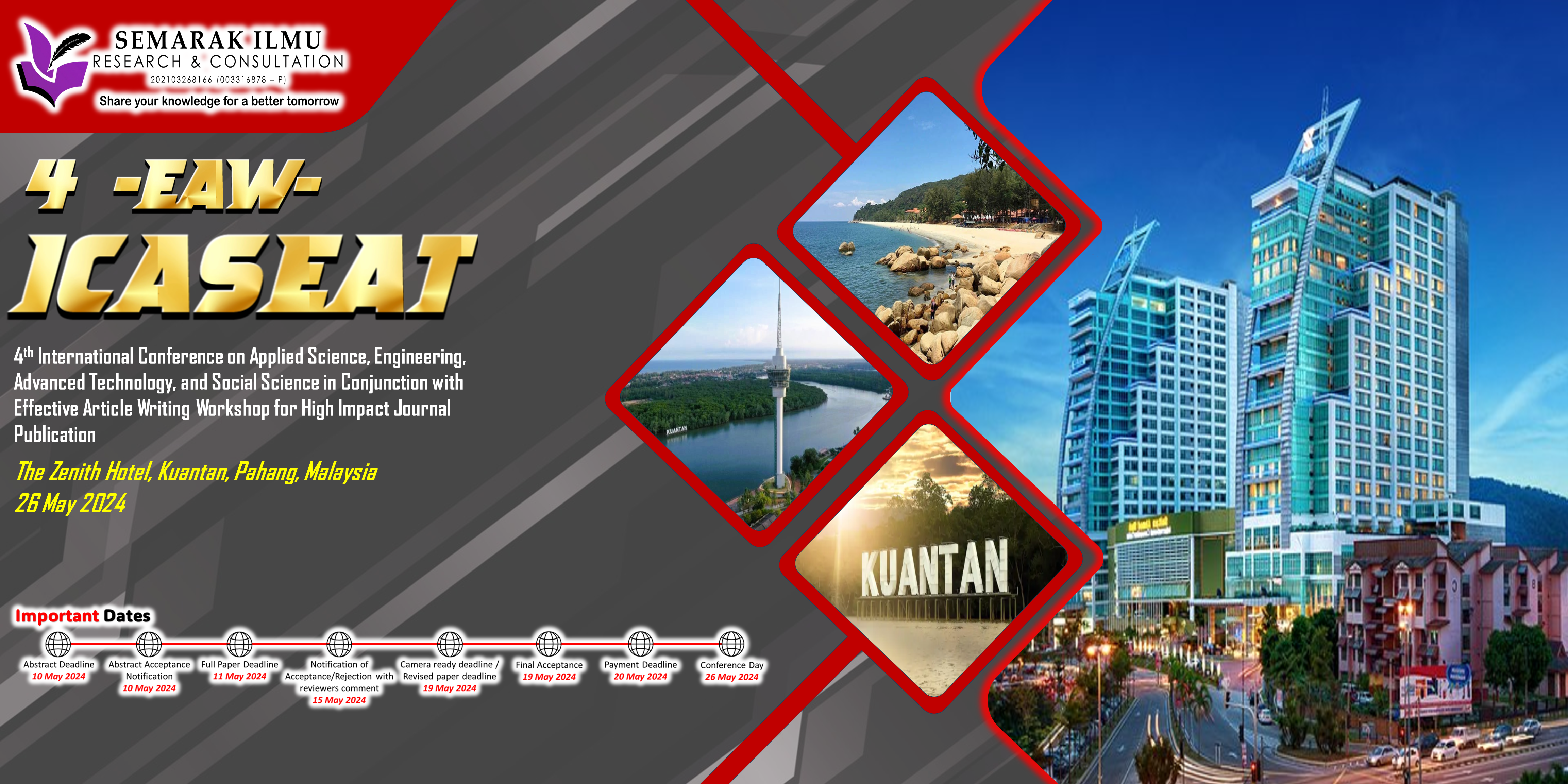 The aim of this conference is to become the leading annual conference in the fields related to Applied Science and Engineering, Advanced Technology, Applied Mechanics, Fluid Mechanics and Thermal Sciences, and Engineering Education. The goal of is to gather scholars, researchers, and practitioners from all over the world to present advances in their research fields and to foster an environment conducive to exchanging ideas and information. Besides that, we also organise a workshop in order to help students, lecturers and researchers to write high quality article for high impact journal publication. Publication in ISI and SCOPUS journals is no more a miracle. By attending this workshop, you will learn the secrets on how to write high impact article for publication in high rank academic journals.