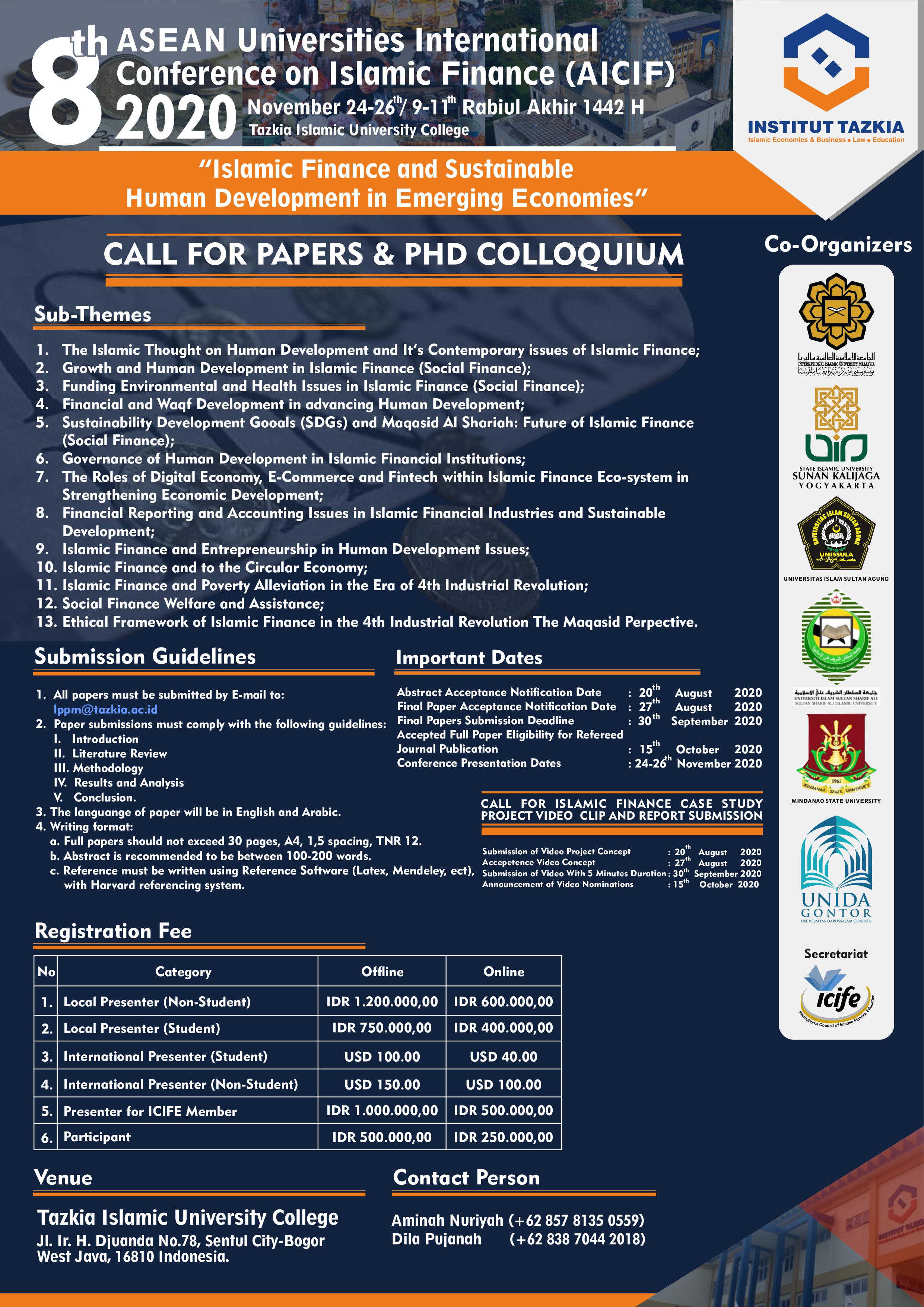The 8th ASEAN Universities International Conference on Islamic Finance (AICIF 2020) invites academics, practitioners, scholars, researchers, policy makers of any government to present their papers in AICIF 2020.