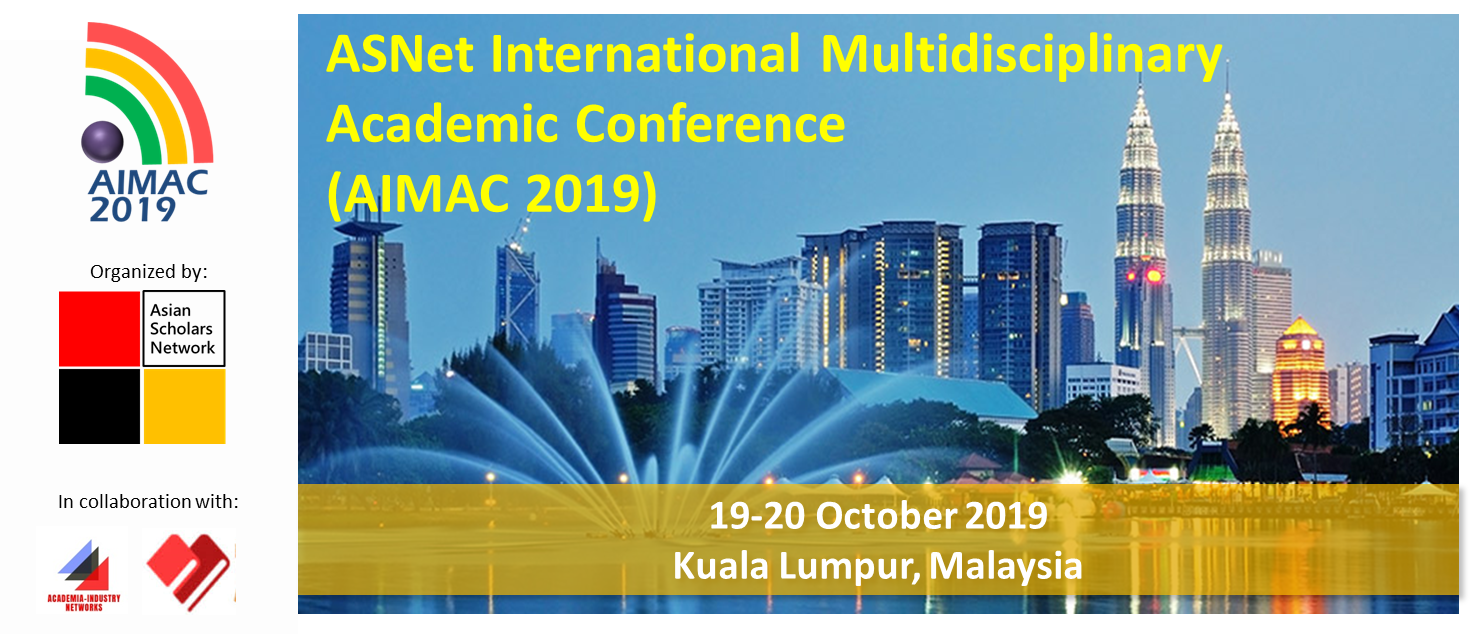 ASNet International Multidisciplinary Academic Conference (AIMAC 2019), organized by Asian Scholars Network (ASNet) in collaboration with Academia Industry Networks (ACINETWORKS) Global Academic Excellence (GAE) and Penerbit Akademia Baru will be held on 19-20 Oct 2019 (Saturday/Sunday) at Hotel Istana, Kuala Lumpur, Malaysia. The objective of the multidisciplinary conference is to gather leading academicians, scholars and researchers to share their knowledge and new ideas as well as to discuss current development in the fields. In addition, the conference also offers opportunities for academicians and industry experts to meet and interact with local and international participants.