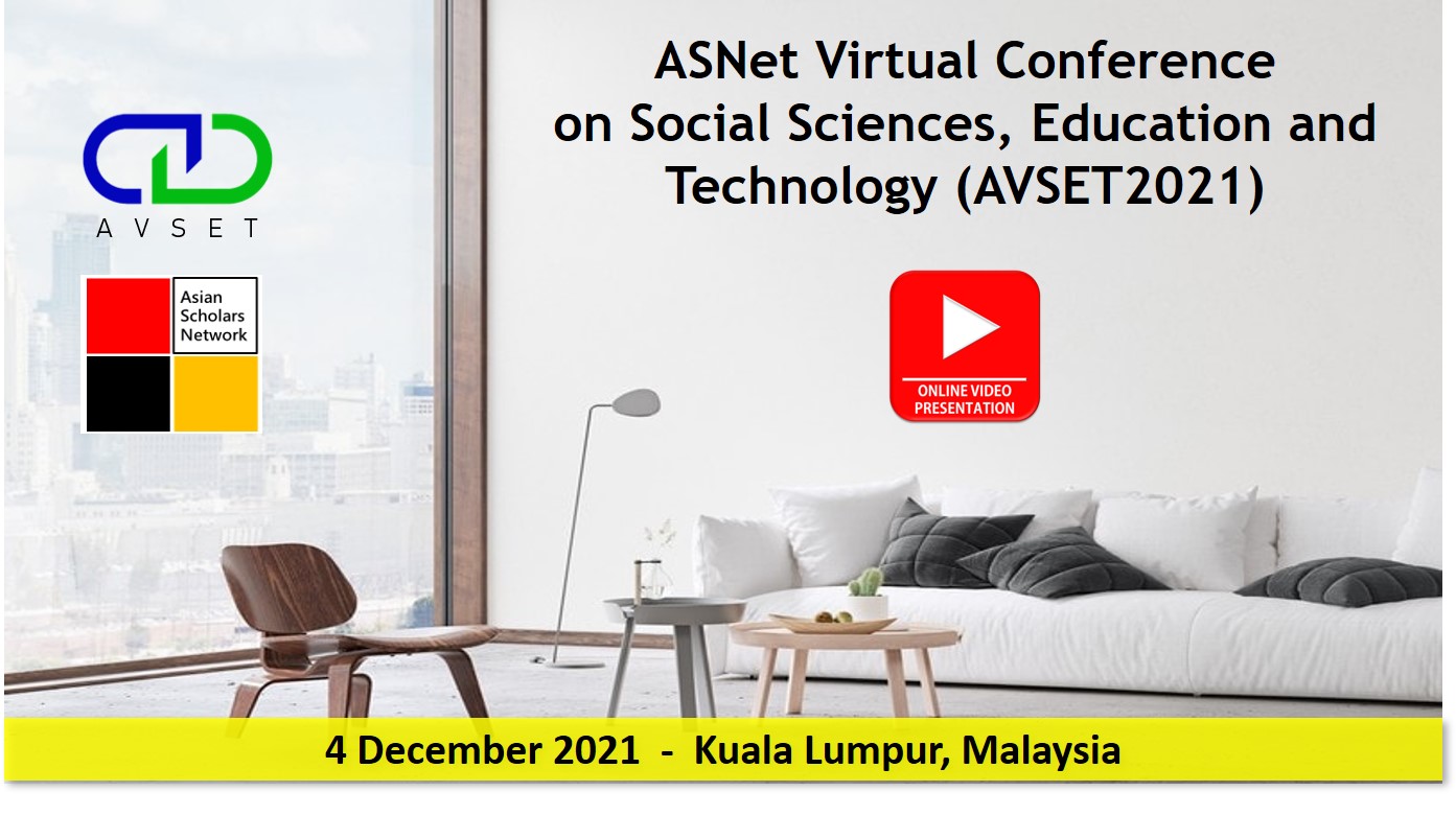 ASNet Virtual Conference on Social Sciences, Education and Technology 2021 (AVSET2021) will be held on 4 December 2021 in Kuala Lumpur, Malaysia. The objective of the multidisciplinary conference is to gather leading academicians, scholars and researchers to share their knowledge and new ideas as well as to discuss current development in their respective fields. In addition, the conference also offers opportunities for academicians and industry experts to meet and interact with local and international participants.