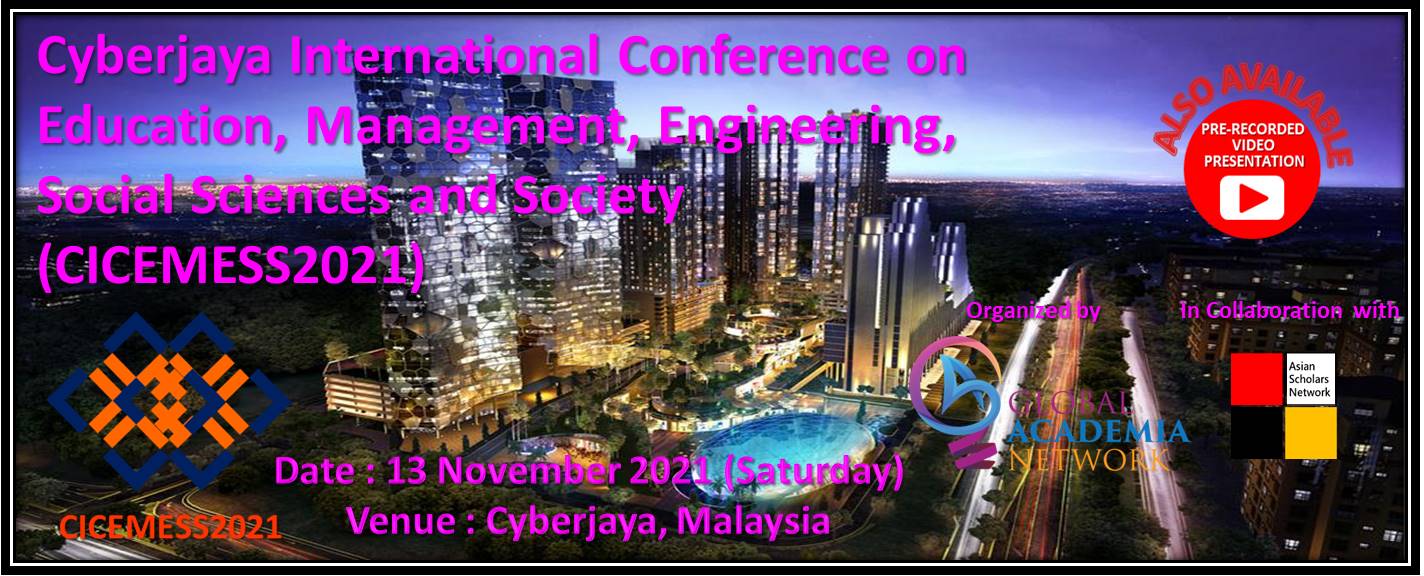It is our great pleasure to announce the Cyberjaya International Conference on Education, Management, Engineering, Social Sciences and Society (CICEMESS 2021) and we would like to invite you to participate in the event. The conference will be held on 13 November 2021 in Cuberjaya, Malaysia. The main objective of CICEMESS 2021 is to provide a platform for researchers, professionals, scholars and academicians to exchange and share their knowledge, information, new ideas and experience in person with their peers expected to join from different parts on the world. This gathering will help the delegates to establish research or business relations as well as to find international linkage for future collaborations in their career path. We hope that CICEMESS 2021 outcome will lead to significant contributions to the knowledge base in these up-to-date scientific fields in scope. In addition, this conference will also offer opportunities for academicians, researchers, engineers, economist, entrepreneurs, journalist and industry experts to meet and interact with local and international participants.
