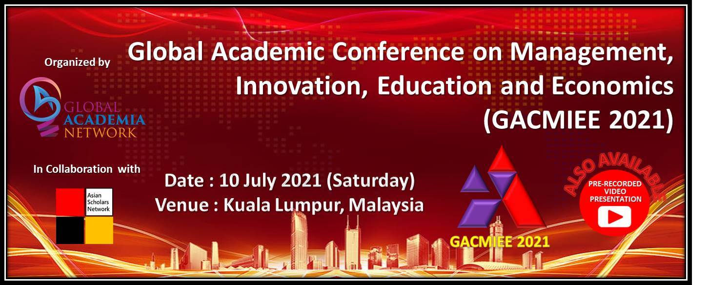 It is our great pleasure to announce the Global Academic Conference on Management, Innovation, Education and Economics 2021 (GACMIEE2021) and we would like to invite you to participate in the event. The conference will be held on 10 July 2021 in Kuala Lumpur, Malaysia. The main objective of GACMIEE2021 is to provide a platform for researchers, professionals, scholars and academicians to exchange and share their knowledge, information, new ideas and experience in person with their peers expected to join from different parts on the world. This gathering will help the delegates to establish research or business relations as well as to find international linkage for future collaborations in their career path. We hope that GACMIEE2021 outcome will lead to significant contributions to the knowledge base in these up-to-date scientific fields in scope. In addition, this conference will also offer opportunities for academicians, researchers, engineers, economist, entrepreneurs, journalist and industry experts to meet and interact with local and international participants.