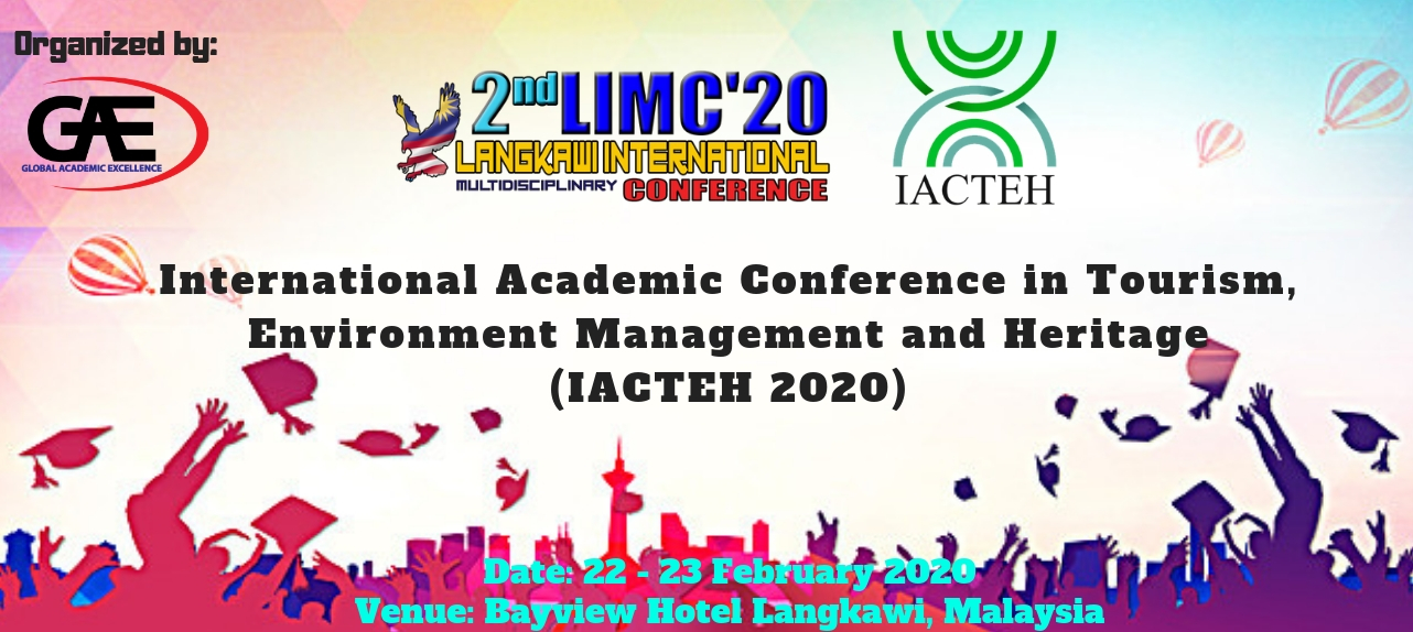 International Academic Conference in Tourism, Environment Management and Heritage (IACTEH) are organize by Global Academic Excellence (GAE) will be held on 22nd (Saturday) and 23rd (Sunday) February 2020 at The Bayview Hotel Langkawi, Malaysia. This conference provide a platform for the intellectuals from various fields and disciplines in Tourism, Environment Management and Heritage to debate and discuss the current issues worldwide as well as finding solutions to the problems, exchange and share their knowledge with others.This conference is held under Langkawi International Multidisciplinary Conference 2020 (2nd LIMC 2020), in which it covers others 8 conference as follows: