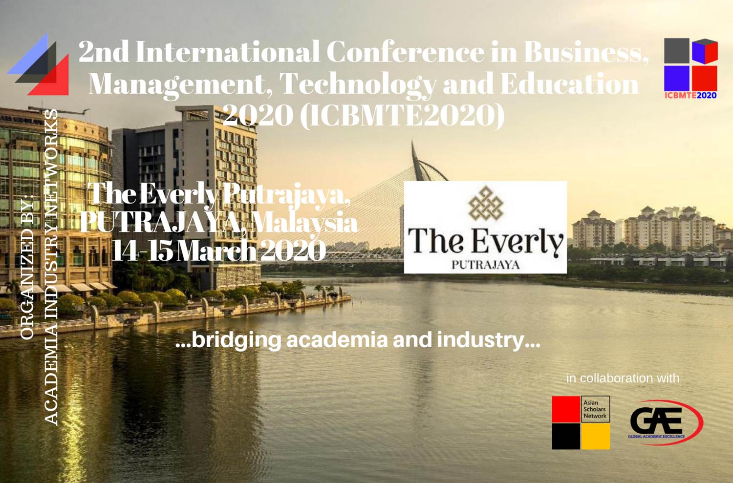 The International Conference on Business, Management, Technology and Education (ICBMTE2020) will be held on Saturday, 14th March 2020 at The Everly Putrajaya, PUTRAJAYA, Malaysia. Organized by Academia Industry Networks, this conference provides a platform for scholars, intellectuals and professionals from various academic and industrial disciplines to present and discuss the current local and global issues, address solutions to the problems and to provide opportunity for participants to exchange and share knowledge and information. ICBMTE2020 welcomes all authors from multiple research disciplines to submit the research papers. All accepted papers will be published in the conference proceeding (with ISBN) and refereed journals indexed by Malaysia Citation Centre (MCC). Papers that meet criteria and have the merits for publication in high index journals will be selected for publication in ERA/ISI/SCOPUS indexed journals.