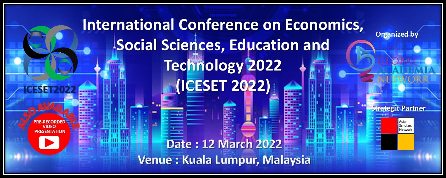 International Conference on Economics, Social Sciences, Education and Technology 2022 (ICESET2022) will be held on 26 February 2022 in Kuala Lumpur, Malaysia. The main objective of ICESET2022 is to provide a platform for researchers, professionals, scholars and academicians to exchange and share their knowledge, information, new ideas and experience in person with their peers expected to join from different parts on the world. This gathering will help the delegates to establish research or business relations as well as to find international linkage for future collaborations in their career path. We hope that ICESET2022 outcome will lead to significant contributions to the knowledge base in these up-to-date scientific fields in scope. In addition, this conference will also offer opportunities for academicians, researchers, engineers, economist, entrepreneurs, journalist and industry experts to meet and interact with local and international participants.