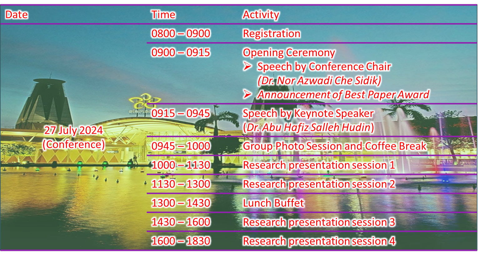 - Participant B: Participant from other Countries WITH accommodation (Standard Superior Room: 2 days, 1 night [26-27 July 2024]): USD 150 (RM600 for Toyyibpay Method)