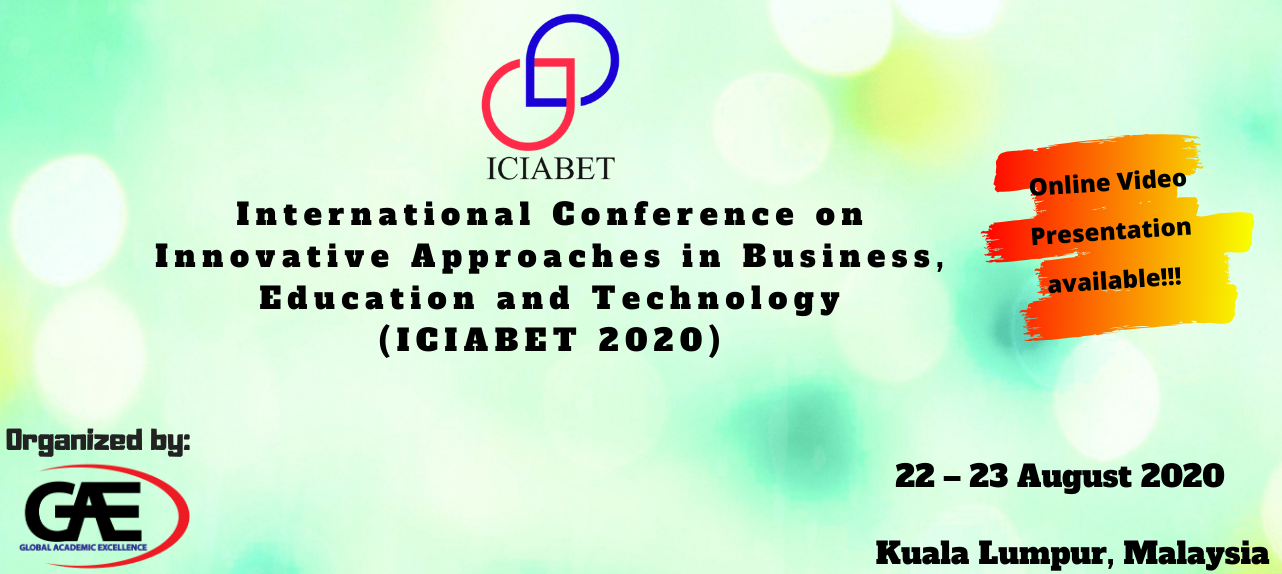 International Conference on Innovative Approaches in Business, Education and Technology 2020 (ICIABET 2020) are organize by Global Academic Excellence (GAE) will be held on 22th August 2020. This conference provides a platform for the intellectuals from various fields and disciplines in Education, Business and Technology to debate and discuss the current issues worldwide as well as finding solutions to the problems, exchange and share their knowledge with others.