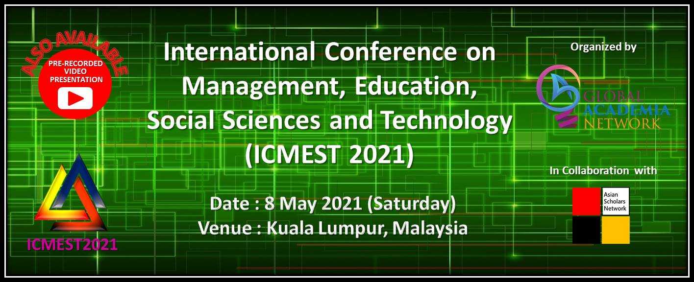 It is our great pleasure to announce the International Conference on Management, Education, Social Sciences and Technology 2021 (ICMEST2021) and we would like to invite you to participate in the event. The conference will be held on 8 May 2021 in Kuala Lumpur, Malaysia. The main objective of ICMEST2021 is to provide a platform for researchers, professionals, scholars and academicians to exchange and share their knowledge, information, new ideas and experience in person with their peers expected to join from different parts on the world. This gathering will help the delegates to establish research or business relations as well as to find international linkage for future collaborations in their career path. We hope that ICMEST2021 outcome will lead to significant contributions to the knowledge base in these up-to-date scientific fields in scope. In addition, this conference will also offer opportunities for academicians, researchers, engineers, economist, entrepreneurs, journalist and industry experts to meet and interact with local and international participants.