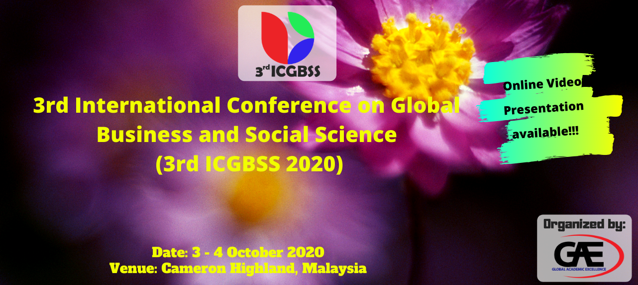 3rd International Conference on Global Business and Social Science 2020 (3rd ICGBSS 2020) are organizing by Global Academic Excellence (GAE) will be held on 3-4 October 2020 via online. This conference provided a platform for the intellectuals from various fields and disciplines in Education, Business, Islamic and Technology to debate and discuss the current issues worldwide as well as finding solutions to the problems, exchange and share their knowledge.