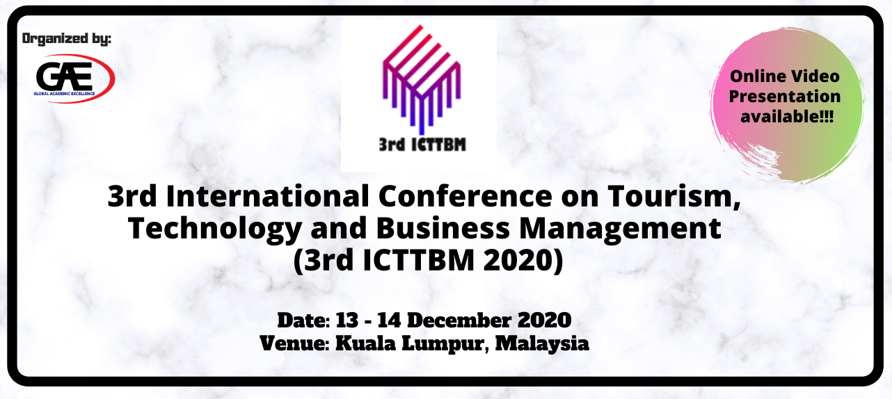 3rd International Conference on Tourism, Technology and Business Management 2020 (3rd ICTTBM 2020) are organize by Global Academic Excellence (GAE) will be held on 13th (Sunday) & 14th (Monday) December 2020 at Kuala Lumpur, Malaysia. This conference provides a platform for the intellectuals from various fields and disciplines in Tourism, Technology and Business Management to debate and discuss the current issues worldwide as well as finding solutions to the problems, exchange and share their knowledge with others.