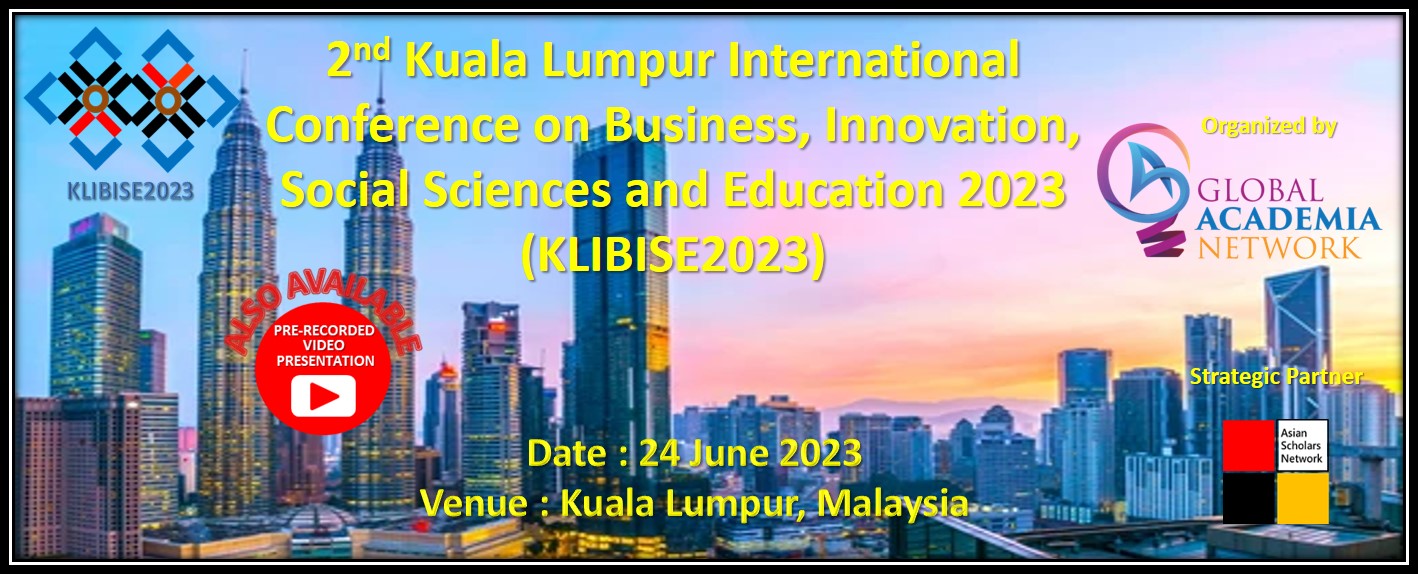 Welcome to 2nd Kuala Lumpur International Conference on Business, Innovation, Social Sciences and Education 2023 (KLIBISE2023) and we would like to invite you to participate in the event. The conference will be held on 24 June 2023 in Kuala Lumpur, Malaysia. The main objective of KLIBISE2023 is to provide a platform for researchers, professionals, scholars and academicians to exchange and share their knowledge, information, new ideas and experience in person with their peers expected to join from different parts on the world. This gathering will help the delegates to establish research or business relations as well as to find international linkage for future collaborations in their career path. We hope that KLIBISE2023 outcome will lead to significant contributions to the knowledge base in these up-to-date scientific fields in scope. In addition, the conference also offers opportunities for academicians and industry experts to meet and interact with local and international participants.