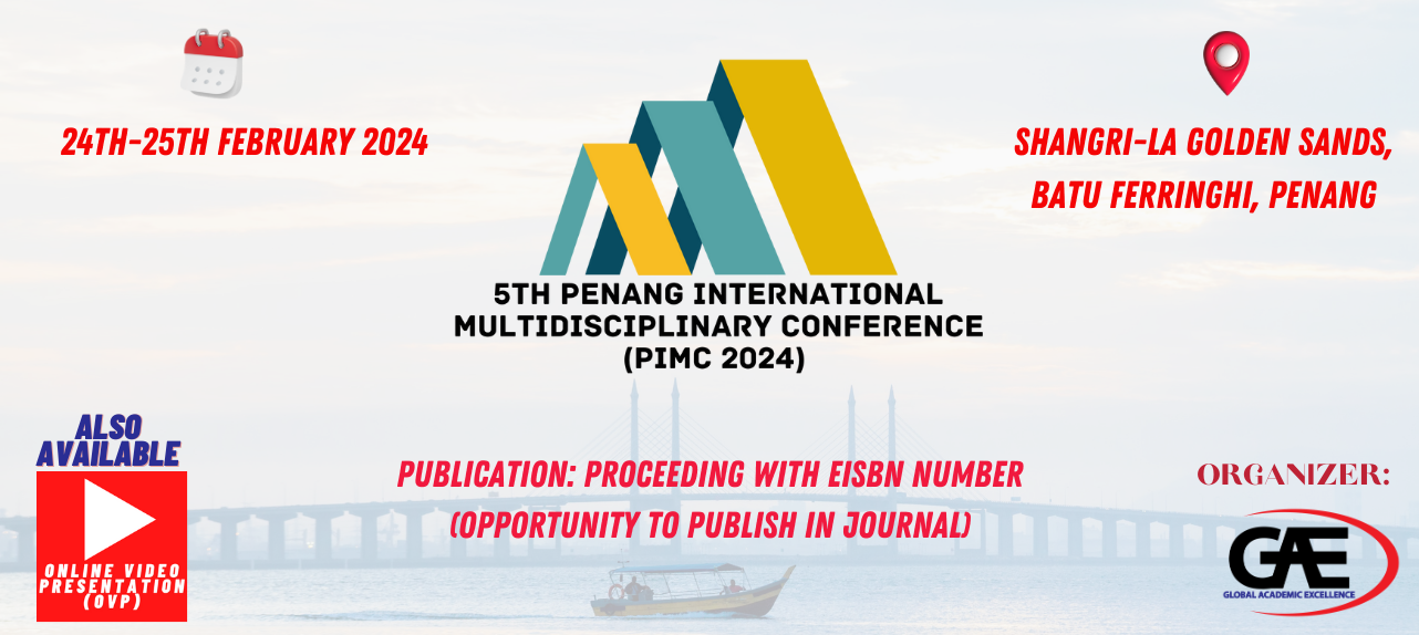 The 5th Penang International Multidisciplinary Conference 2024 (5th PIMC 2024) organized by Global Academic Excellence (M) Sdn Bhd (GAE) will be held on 24th-25th February 2024 at Golden Sands by Shangri-La, Penang, Malaysia. This conference provides a platform for academicians, researchers, professionals, intellectuals and scholars from various fields and disciplines to debate and discuss the current issues worldwide as well as finding solutions to the problems, exchange and share knowledge and information, establish business or research relationships and find global partners for future collaboration.