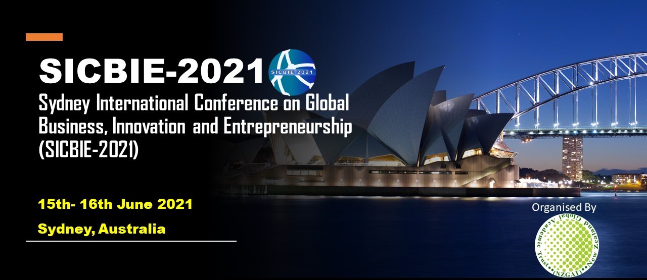 The Sydney International Conference on Global Business, Innovation and Entrepreneurship 2021 (SICBIE-2021) organised by the New Zealand Global Academic Trust (NZGAT) will be held virtually on 15th-16th June 2021 at Sydney, Australia. This conference provides a platform for the intellectuals from various fields and disciplines in Global Business, Innovation and Entrepreneurship to debate and discuss the current issues worldwide as well as finding solutions to the problems, exchange and share their knowledge with others. This platform of the multi-disciplinary conference allows participants an opportunity to share their school of thoughts and perspectives from different fields in the great atmosphere of Sydney’s winter time.
