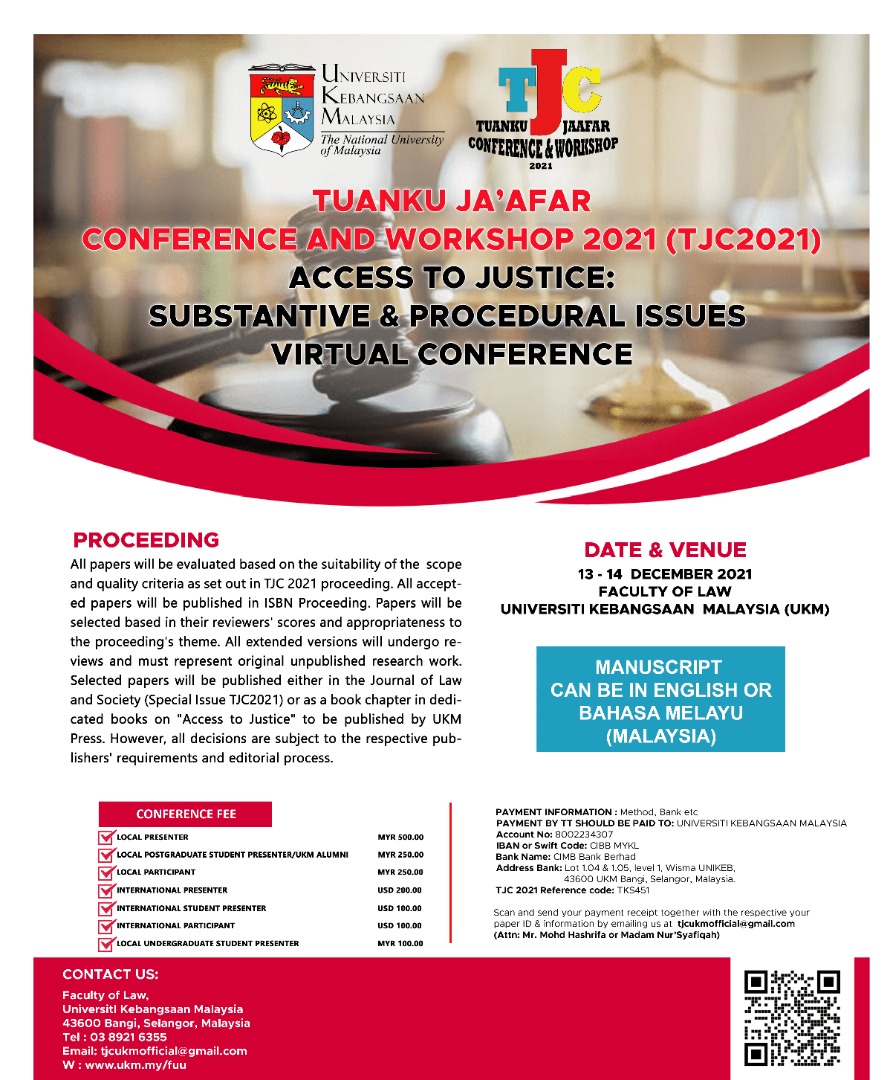 Tuanku Ja�afar Conference and Workshop 2021 (TJC 2021), Theme: Access to Justice: Substantive & Procedural Issues (Virtual Conference) is the Fifth of the biennial series since 2007. This conference serves as a medium to bridge theories and practices.